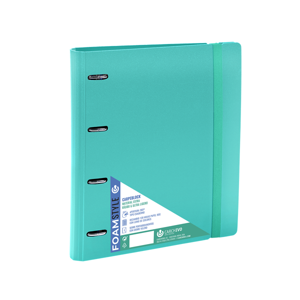 Carpeblock A5 de 4 anillas de polipropileno foam extra rígido de 2 mm y ultra ligero. Lomo redondo y goma de cierre. Recambio de 100 hojas de 90 g con lomo de colores. Sobre con solapa con cierre adherente. Dispone de 4 separadores de 500 micras.