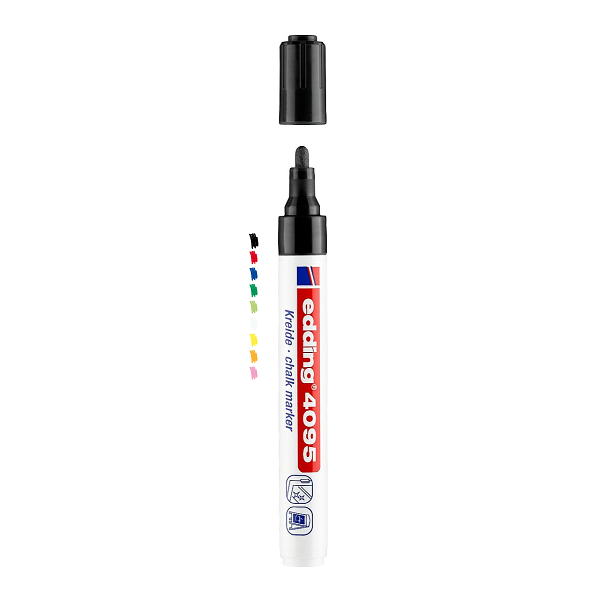 Marcador para rotular y decorar ventanas, cristales y cualquier otra superficie no porosa. Tiza líquida a base de agua de olor neutro. Flujo regulado mediante sistema de bombeo. Punta redonda con trazo de 2-3 mm.
