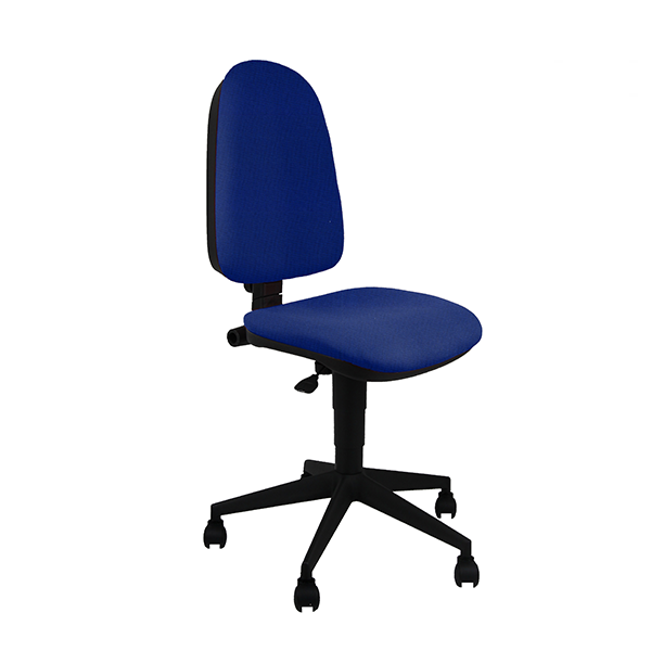 Silla operativa Team tapizada en azul o negro. Contacto permanente. Respaldo alto . Base negra de Nylon. Brazos opcionales.